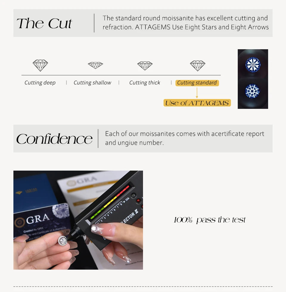 The moissanite diamonds used by ATTAGEMS are laboratory grown gemstones that are carefully selected to ensure that all moissanite is D color VVS1 clarity with the same optical and physical properties as South African diamonds. The diamond fire is more than 2.5 times that of South African diamonds. All moissanite 100% easily passes the highest point of the diamond tester. If you need, we also provide high quality colored moissanite products